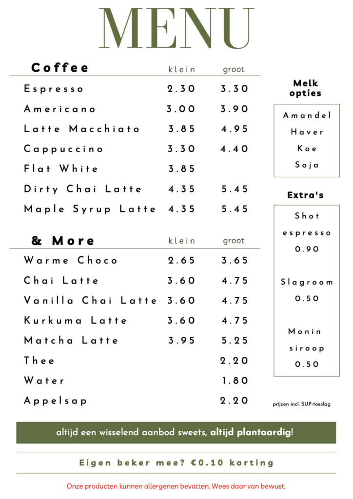 Naast het onderstaande aanbod, kan ik natuurlijk ook andere warme dranken maken. Stel gerust je vraag!